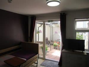 Knowing the resident’s love for flowers and the outdoors, we created a beautiful garden space right outside their room. This personalized touch provided a serene and familiar environment where the resident could relax and enjoy the beauty of nature. The garden became a sanctuary, offering peace and joy through the simple pleasures of sunlight and blooming flowers.